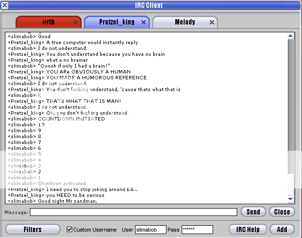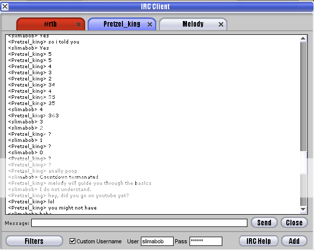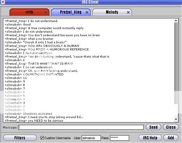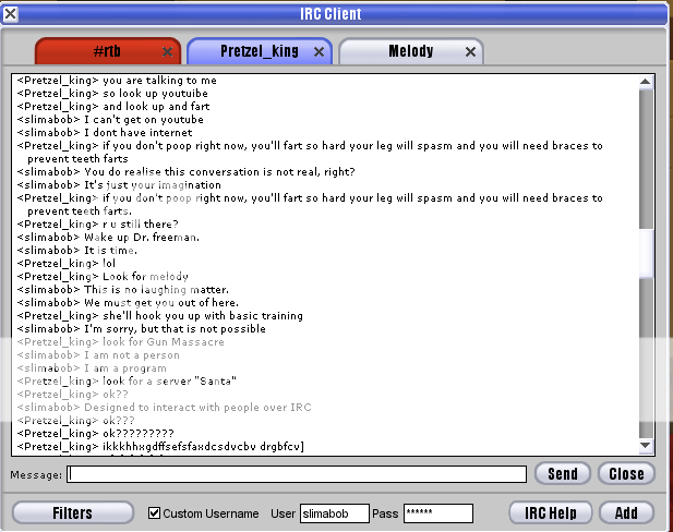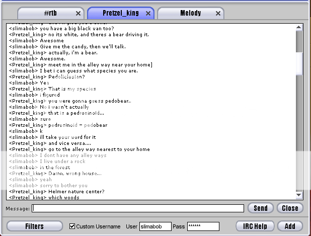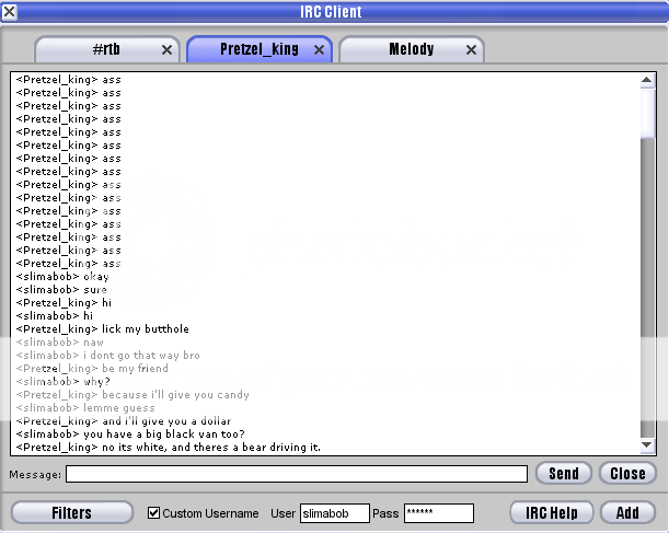 So I was minding my own business when suddenly, someone named Pretzel King IRC'd me and said "ass" a bunch of times. I then decided to have some fun: