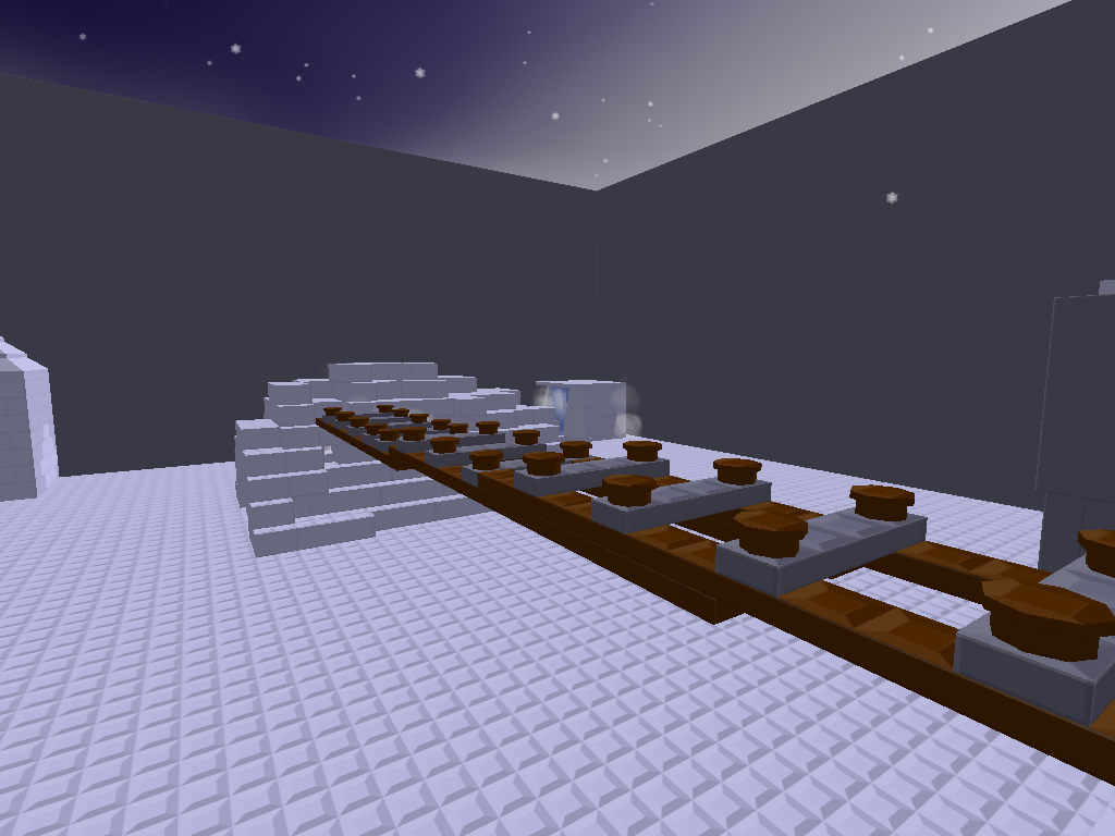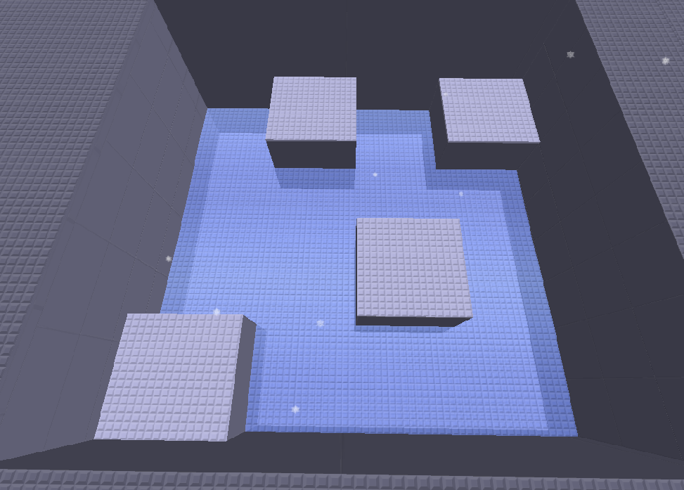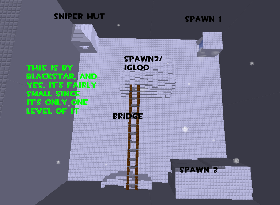 It's fairly small, that is because I am working on small levels at a time, and no more than 3 people will be fighting at a time. I will probably post more of this later. There are three spawns, one in a little IceBox, another in an igloo, and yet another inside a cave. And there is a sniping hut made of snow that you can break in one side to sneak in.