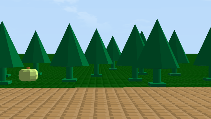 A very large apple sitting in a pine tree forest.