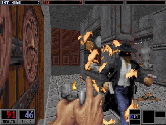 Is there an enemy that throws bricks at you in this game? Because I remember a very gory PC game my dad played when I was like three and it always stuck with me that there is an enemy that throws bricks.