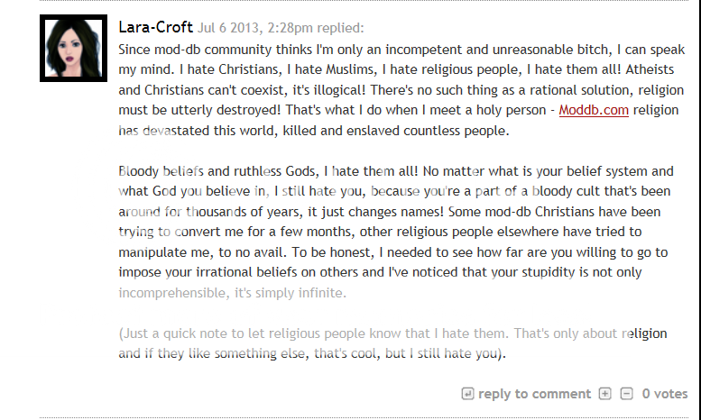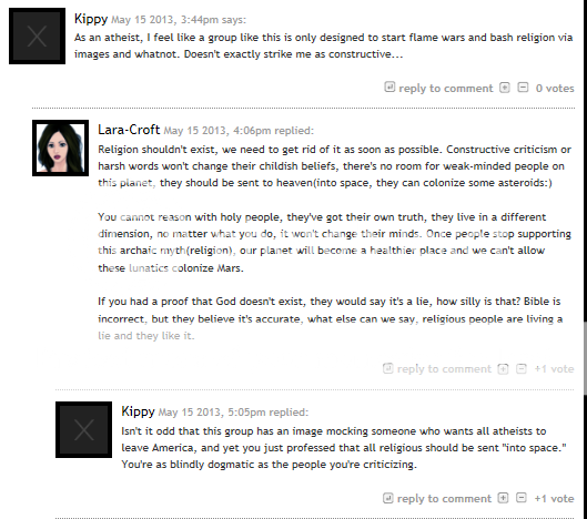 they're just edgy neckbeards hiding behind a screen to me. sometimes reddit is funny, but they don't have to be richards. i'm atheist, but really? it's just not necessary