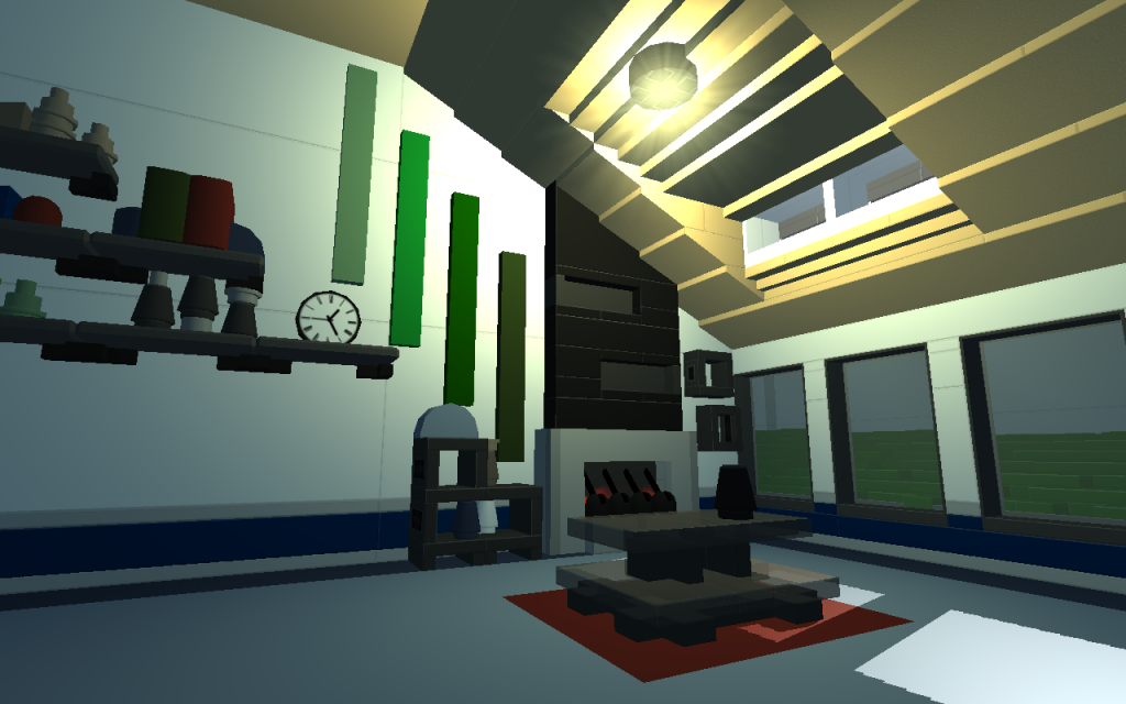 What I love is the style of each individual piece. You added some nice shelving, a cool fireplace, nice windows, each component looks great. The colors on those separate components also works out well.