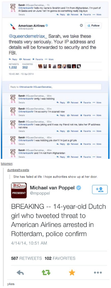 I don't blame the authorities for arresting her, as someone else said previously: "a threat is a threat". It's true, in this day and age risks can't be taken. Any measures should be used to prevent a dangerous situation from starting up.