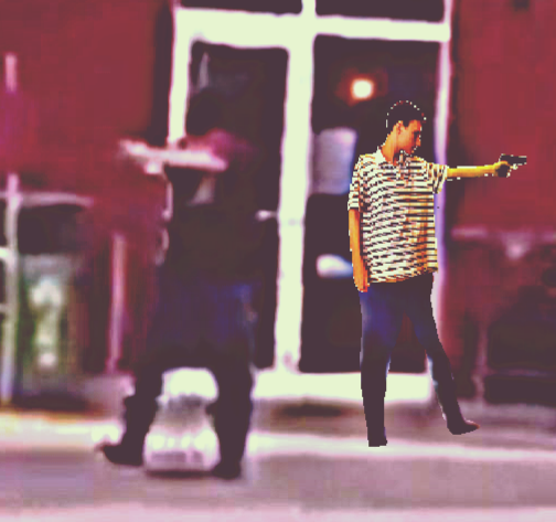 Exclusive photographs of two gunmen firing on people exiting the mall, Sam Hyde is not pictured in this one