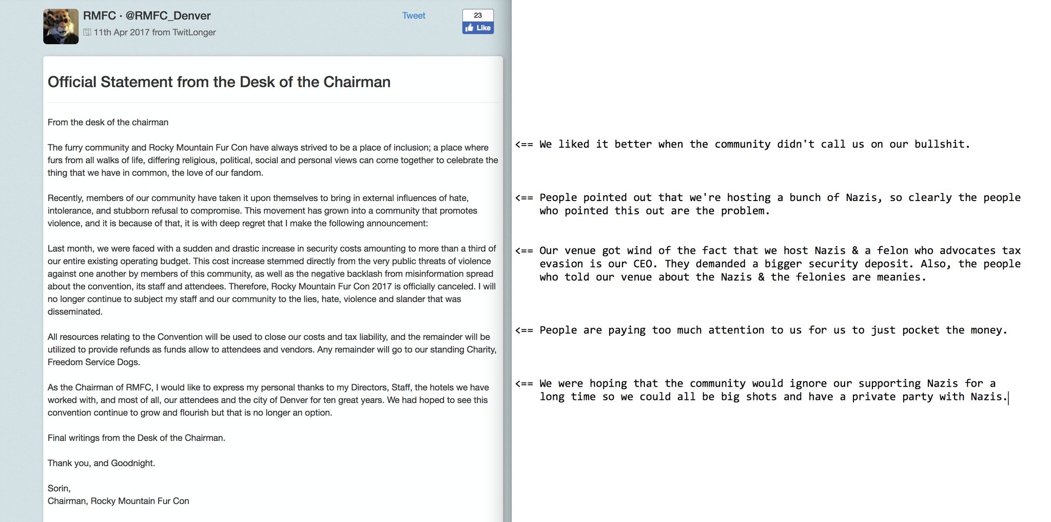 http://lawyersandliquor.com/2017/04/free-furry-of-the-land-when-sovcits-and-furries-collide/A lawyer has brown townyzed links between the creep and the Sovereign Citizen movement.--Someone has also happily annotated the official letter from the company running the Furry convention, explaining why they're "not" at fault for what has happened.