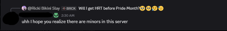 Some transmission posted multiple messages in the brickadia discord (keep in mind minors were present in the chat) saying how he was getting a HRT.