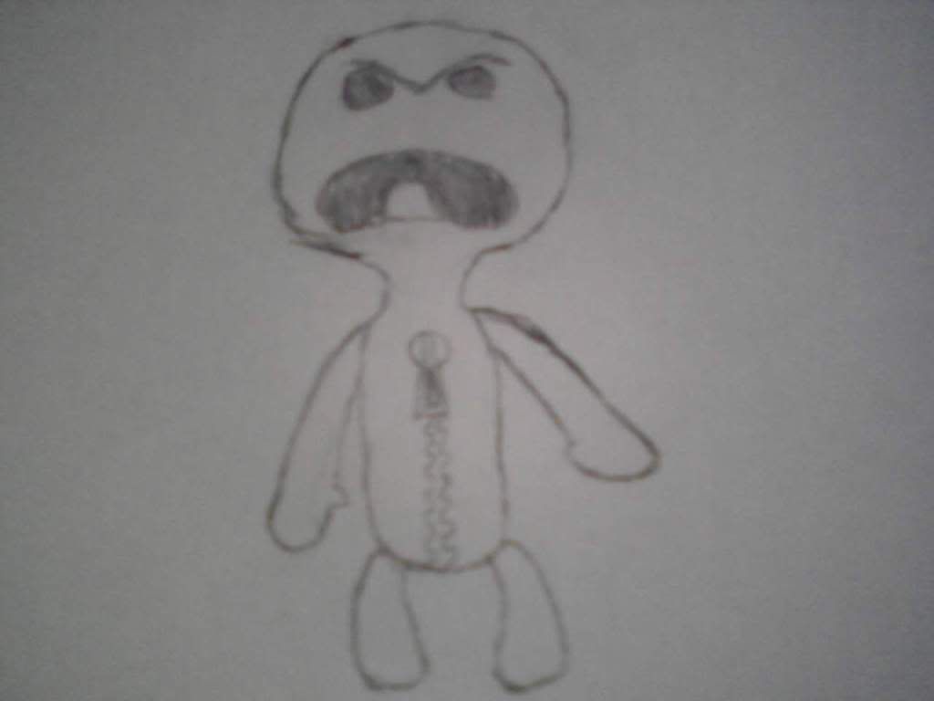 I wanted to see how good i could actually draw Sackboy, but instead of a normal Sackboy, i made how mine looks in LBP, Ninja Skin, Ninja Mask, God of War Torso, Vampire Fangs (Not shown), and some kind of pants, i forget the name, but it's one of the first pants i got