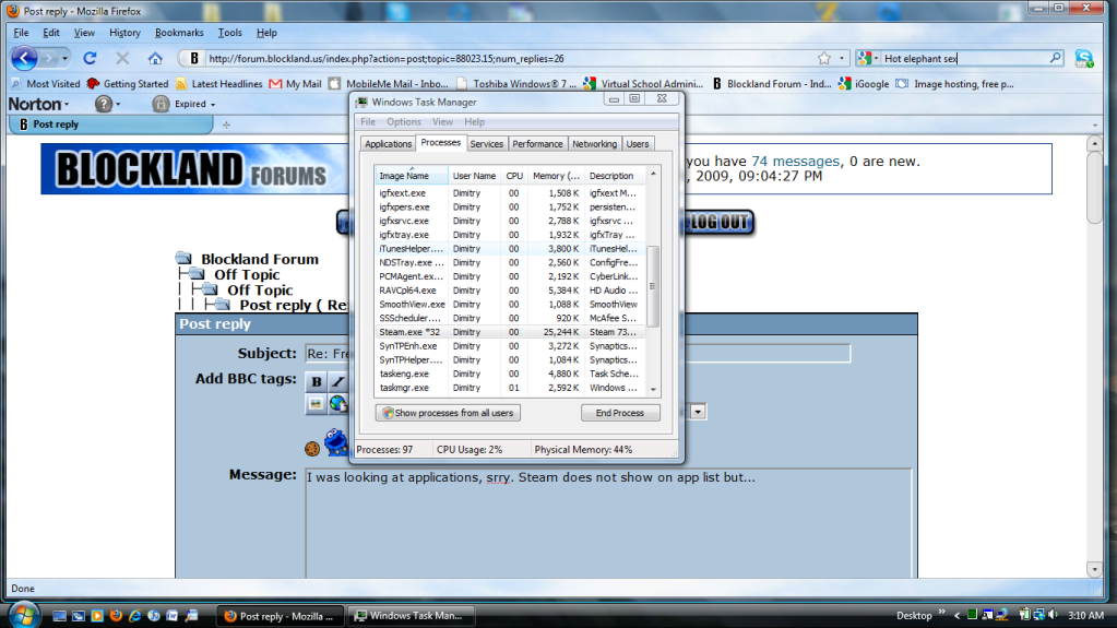 Quote from: Riot on October 29, 2009, 11:11:56 PMThere it is. Select it, hit End Process (say Yes when prompted), and then restart Steam. Should work now.ok